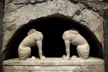 In this handout photo released by the Greek Culture Ministry on Thursday, Aug. 21, 2014, two large stone sphinxes are seen under a barrel-vault topping the entrance to an ancient tomb under excavation at Amphipolis in northern Greece.