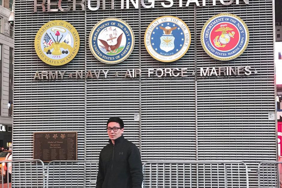 This November 2017 photo provided by Badamsereejid Gansukh shows him in front of a U.S. military recruiting office in New York's Times Square. Gansukh, whose recruiter told him his Turkish language skills would be an asset to the military, said he didn’t know he was discharged at all until he asked his congressman’s office in the summer of 2018 to help him figure out why his security screening was taking so long. (Courtesy of Badamsereejid Gansukh via AP)