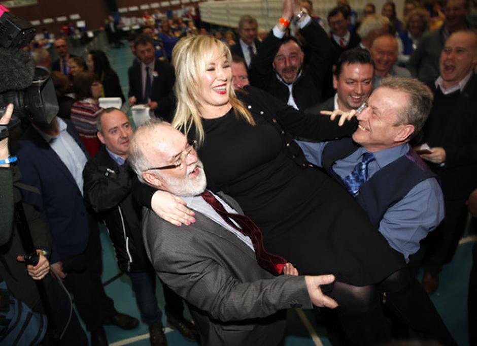 Sinn Fein's new leader in Northern Ireland, 40-year-old Michelle O'Neill, was mobbed by supporters as the results rolled in.