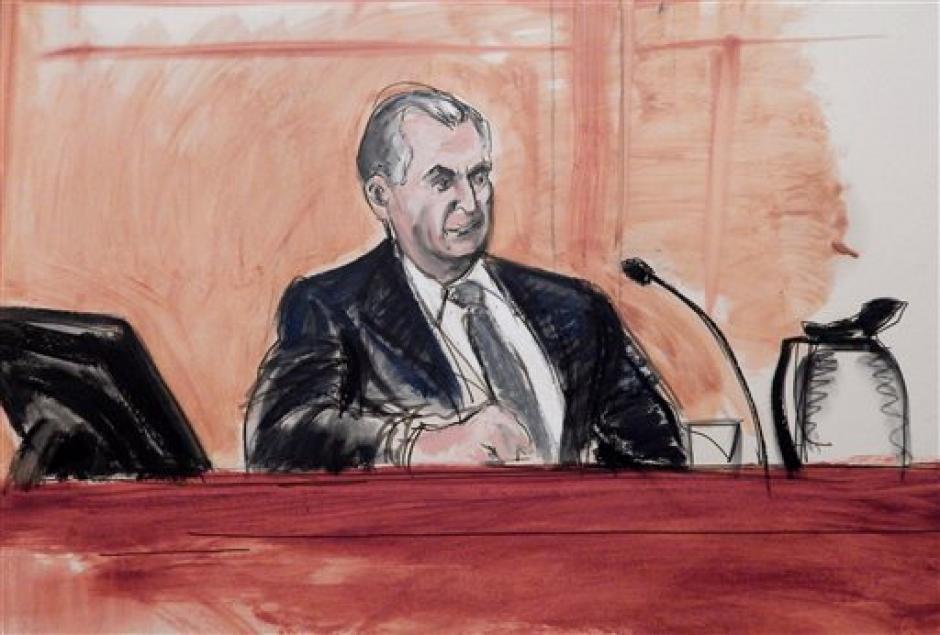 In this courtroom sketch, former Bonanno crime family underboss Salvatore Vitale testifies during the trial of reputed gangster Vincent Asaro, Monday, Oct. 19, 2015, at federal court in the Brooklyn borough of New York. The legendary 1978 theft at the Kennedy Airport's Lufthansa cargo terminal was dramatized in the hit film "Goodfellas." (Elizabeth Williams via AP)