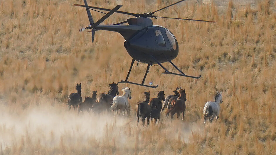 TOOELE, Utah (AP) — The sound of the helicopter propeller thundered across the horizon as it dipped down toward mustangs dotting the golden brown plain. The horses burst into a gallop at the machine's approach, their high-pitched whinnies rising into the dry air.