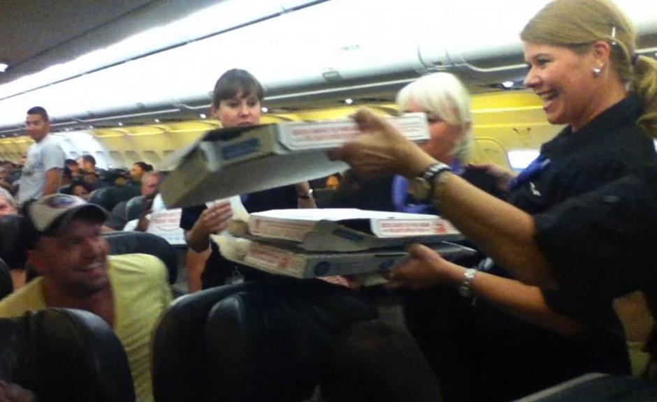 In all, Ritchie said his crew made about 35 pizzas and delivered them to the airport, where the driver handed the food off to flight attendants. One of the passengers sent KUSA-TV a picture of flight attendants handing out pizza boxes.