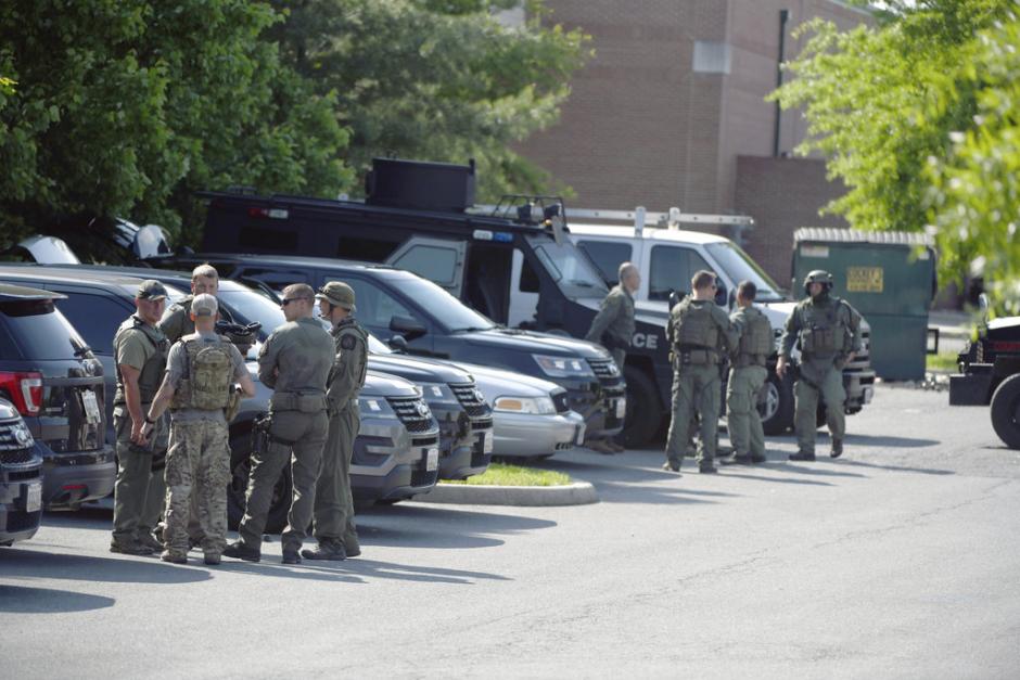At a gas station located at a cordoned-off intersection, some residents gathered to watch three helicopters of TV news crews buzzing overhead, an unmarked car with law enforcers, including one officer cradling a rifle in the back seat, drove past and was waved through by police manning the intersection.