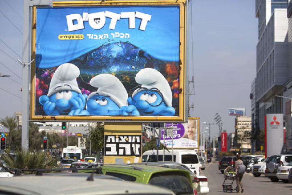 The original poster shows Smurfette alongside friends Brainy, Clumsy and Hefty. But in Bnei Brak, she's nowhere to be found.