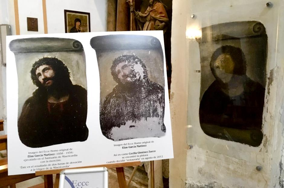Gimenez, 85, smiled as she entered the new center in a wheelchair for the inauguration ceremony. She became a sensation when pictures spread on the Internet of an "Ecce Homo" ("Behold the Man") mural she disfigured while trying to restore it. Twitter users redubbed it "Ecce Mono" ("Behold the Monkey").