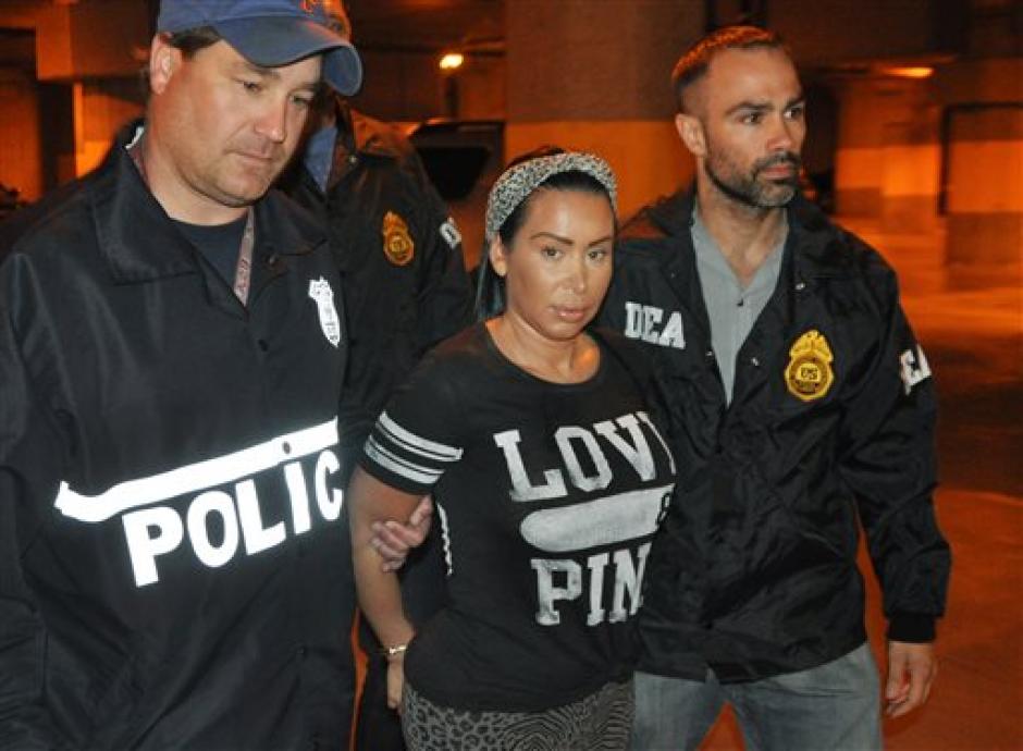 Samantha Barbash, center, is escorted by law enforcement officers following her arrest in New York. Barbash is allegedly part of a crew of New York City strippers who scammed wealthy men by drugging them and running up extravagant bills at topless clubs while they were in a daze, according to authorities. (AP Photo/DEA)