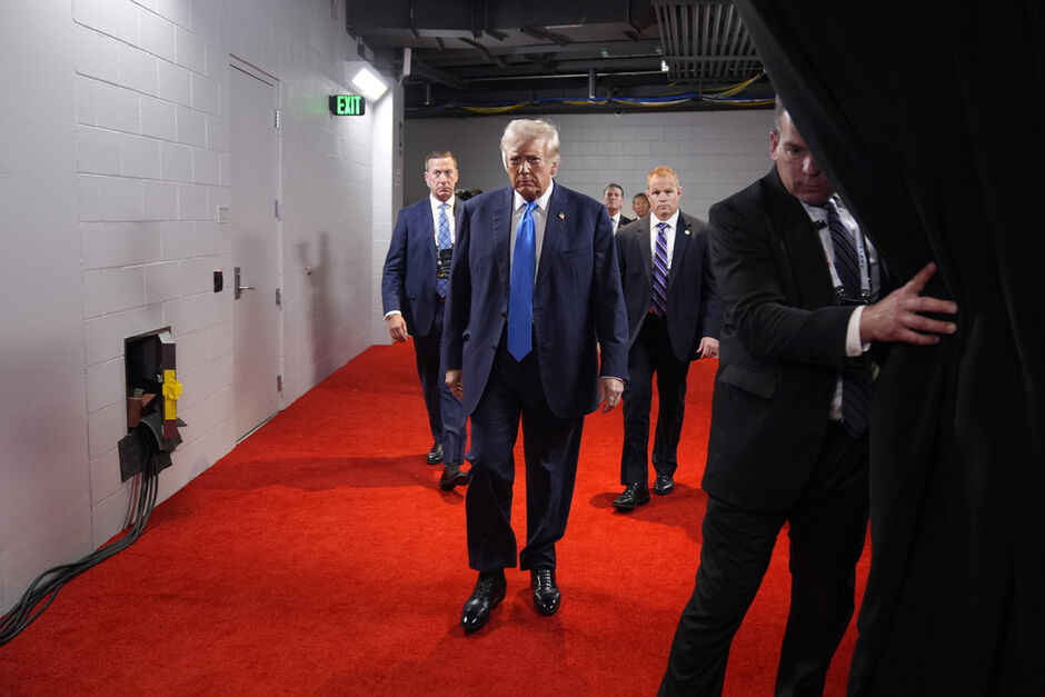 It was a marked contrast from former President Donald Trump, who entered the hall a few minutes later and was separated from supporters by a column of Secret Service agents. His ear still bandaged after an attempted assassination, Trump closely hugged the wall. Instead of handshakes or hellos for those gathered, he offered fist pumps to the cameras.