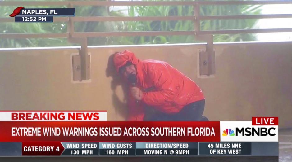 Other correspondents frequently struggled to keep their footing. "I'm just taking a knee for a second," said Sanders said when the wind got too intense. NBC's Jo Ling Kent seemed fearless walking around Miami Beach. CBS' Elaine Quijano spied some debris blowing her way; fortunately it proved only to be some palm fronds.
