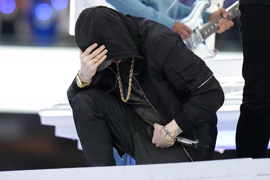 As his rendition of “Lose Yourself” ended, Eminem took a knee and held his head in his hand in apparent tribute to former San Francisco 49ers quarterback Colin Kaepernick, who took a knee during the national anthem to protest police brutality during the 2016 season.